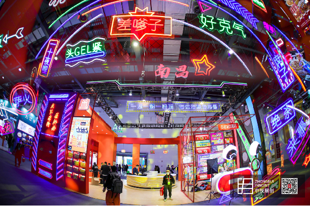 右侧为赛博朋克风格打卡墙,表现南昌米粉宣传标语、滕王阁、第二届中国米粉节logo、江西米粉统一标识,体现独特的南昌米粉文化。并放置南昌传统大瓦罐,增强体验感,背景墙悬挂霓虹灯字牌南昌方言,潮流时尚,凸显地域特色。LED屏循环播放南昌米粉宣传片,墙壁悬挂南昌米粉历史及米粉工艺图文展板,正中间设置快闪米粉店,可供来往观众品尝。左侧设置企业展示区,展示南昌米粉企业。