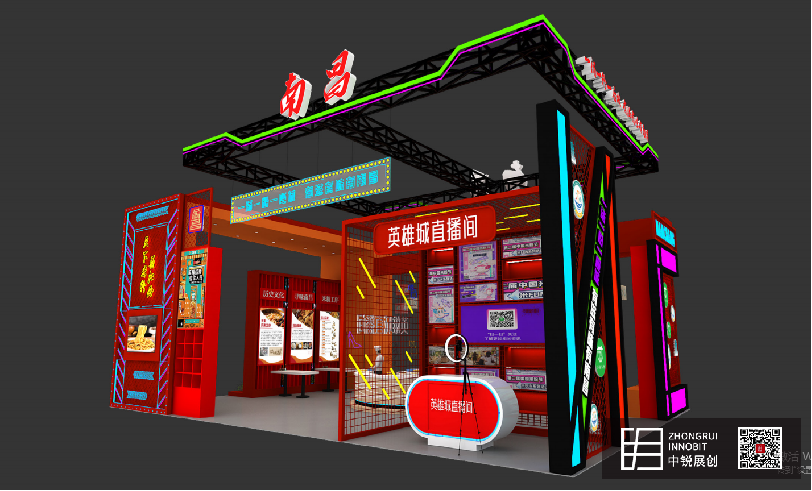 南昌馆主色调以浓烈的红色及橘黄色为主,前后通透的开放式结构,方便观众进出。前后方利用钢架结构设计红色“南昌”字样,门楣及入口侧方设计有“一汤一粉一座城,有滋有味有南昌”的宣传口号。正门侧方设置英雄城直播间,为南昌米粉品牌直播带货。